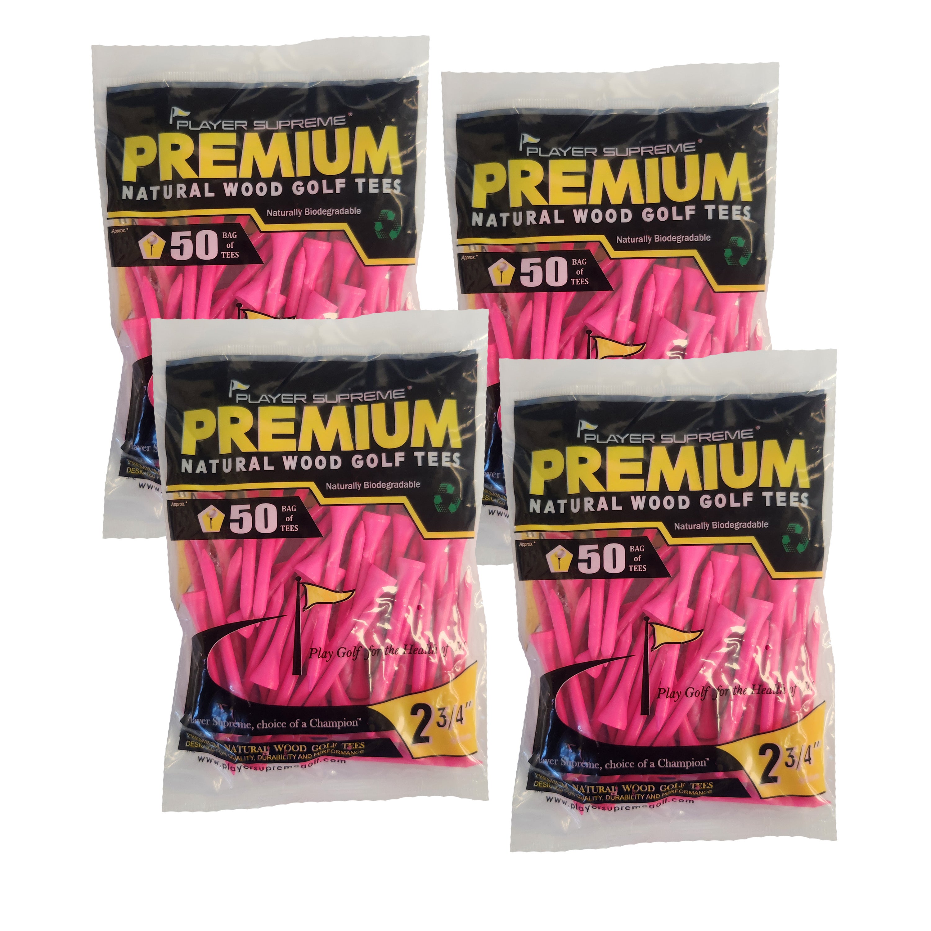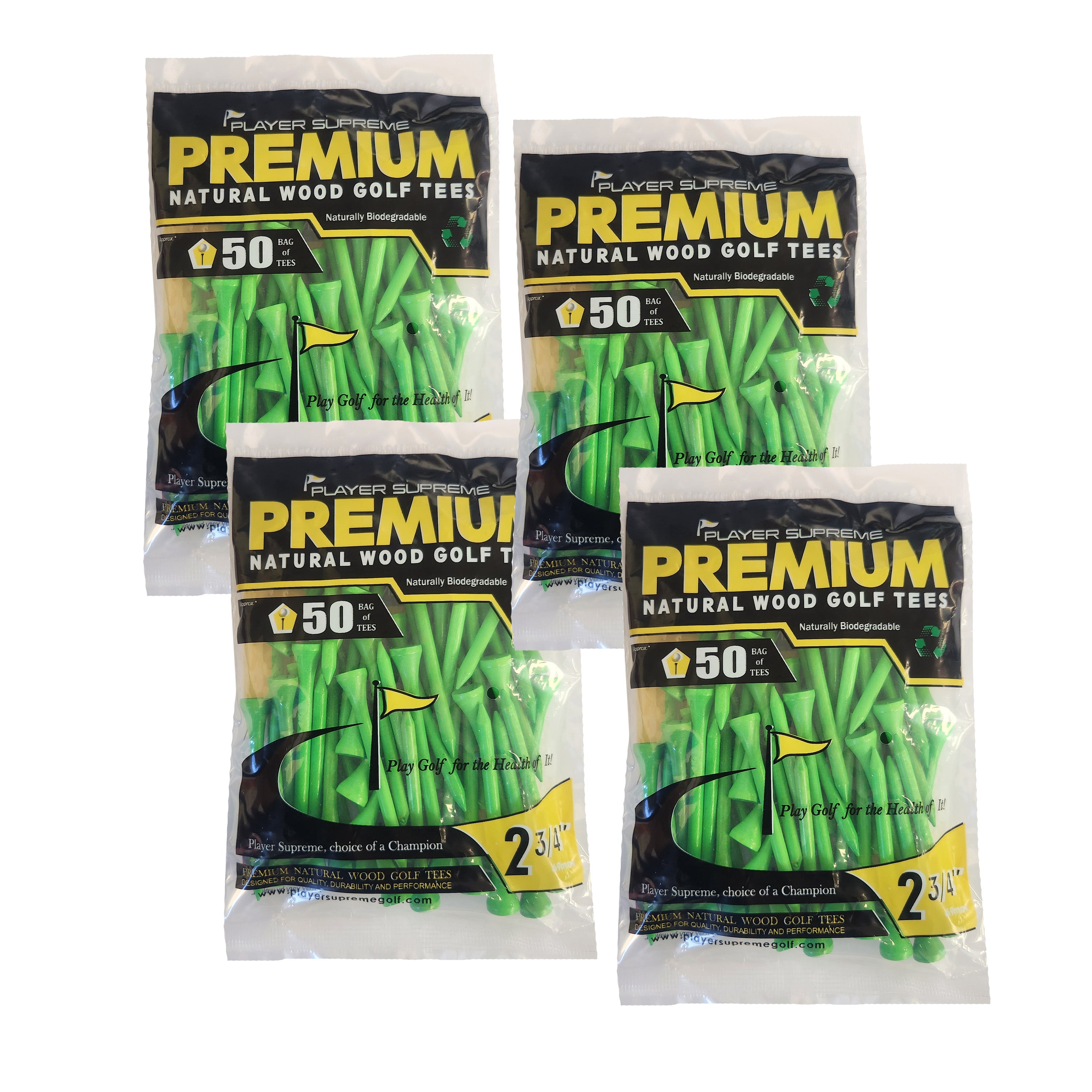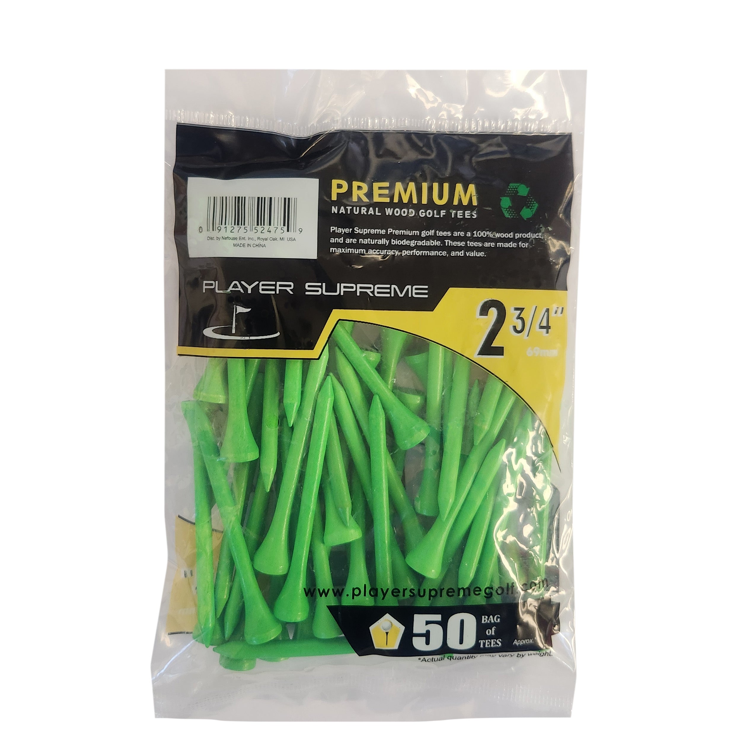 Player Supreme Premium golf tees are a 100% wood product and are naturally biodegradable. These tees are made for maximum accuracy, performance and value. Available in 3 colors: Lime Green, Neon Orange & Raspberry