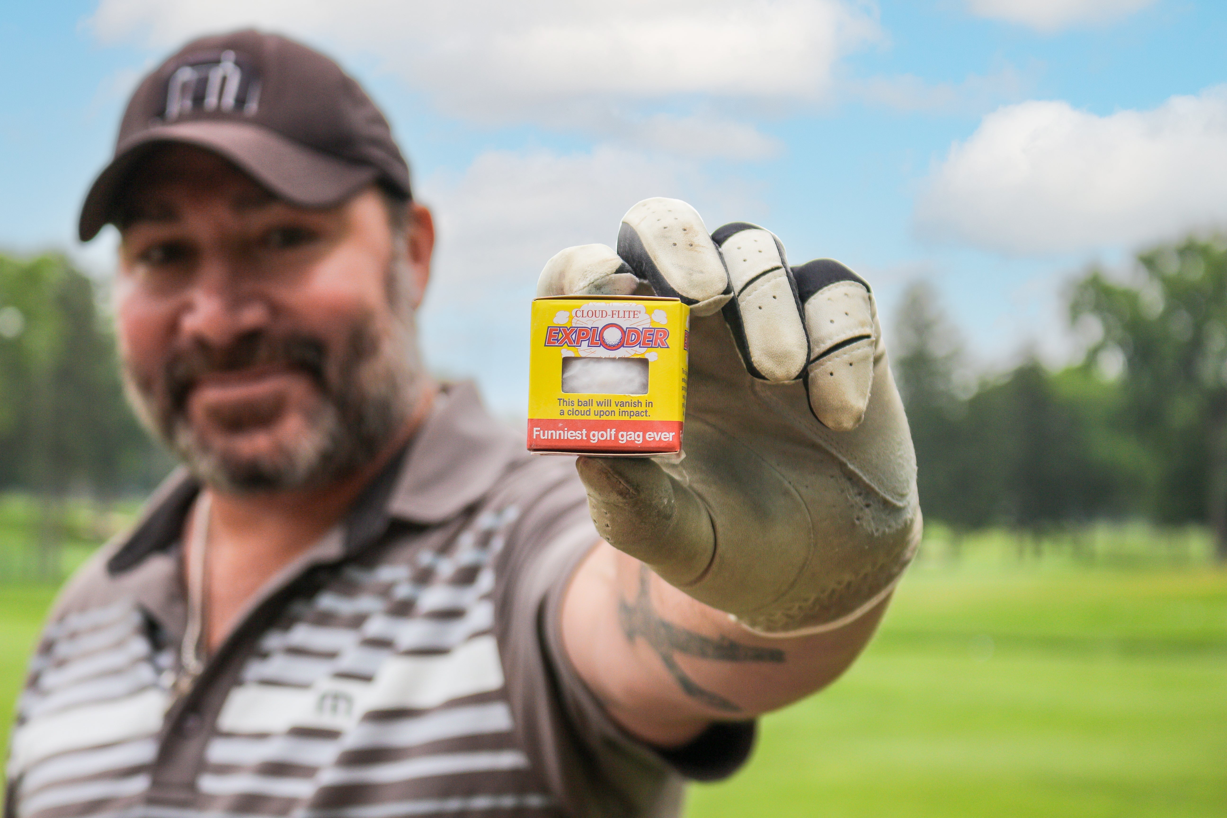 Bet your partner that he can't repeat that great long iron shot... drop the exploding golf ball on the fairway... and stand back for the biggest laugh ever!